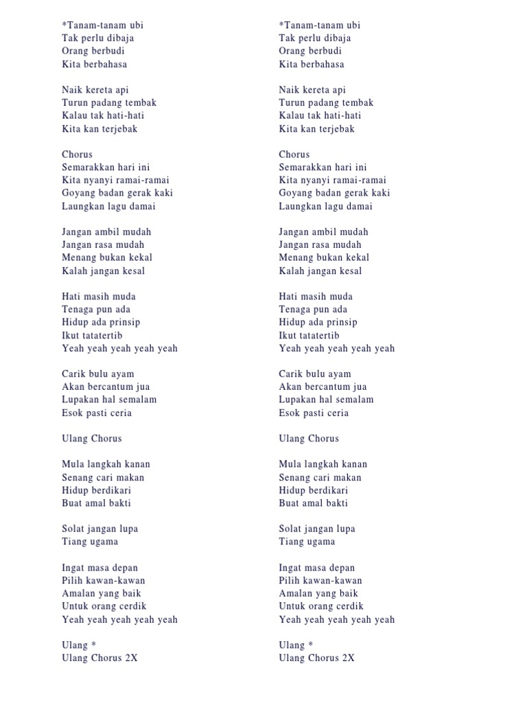 E Tanam-tanam ubi E Tak perlu dibaja E Orang berbudi E Kita berbahasa E Naik kereta api E Turun padang tembak E Kalau tak hati-hati E Kita kan terjebak B A SEmarakkan hari ini E Kita nyanyi ramai-ramai B A Goyang badan gerak kaki E Laungkan lagu damai A A Jangan ambil mudah Jangan rasa mudah G Menang bukan kekal Kalah jangan kesal E Hati masih. Masa ubi jalar siap untuk dipanen adalah ketika tanaman ubi sudah berumur 35-45 bulan tergantung varietas ubi jalar yang ditanam. Jika anda ingin menyimpannya terlebih dahulu maka simpanlah pada tempat yang kering dan teduh tanpa dicuci terlebih dahulu.